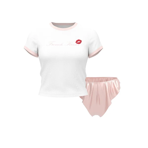 When cute-and-sexy is the vibe, this sweet Set is your go-to. A cropped baby Tee is matched with glossy satin flutter Shorts for a flirty look that’s easy, inviting, and sealed with a kiss— playful pouts are embroidered on each piece.