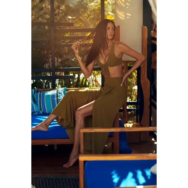 Tecla bikini top features a front knot detail and an openwork crochet effect at the back. Offers sewn in soft cups.