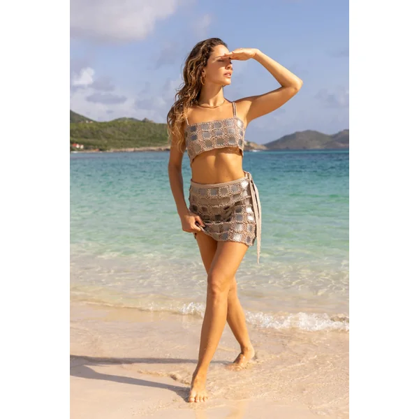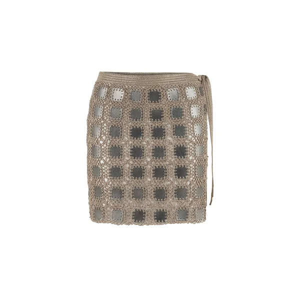 Terra mini skirt features a fusion open weave crochet and faux metallic leather. Offers a side tie to adjust the fit.