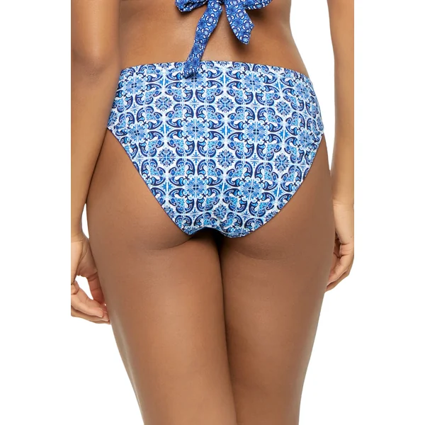 Hipster bikini bottom is reversible and featured shirred sides and moderate bottom coverage.