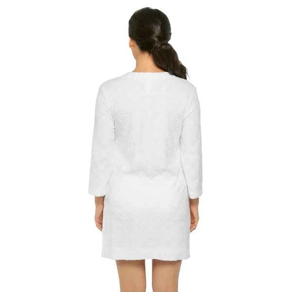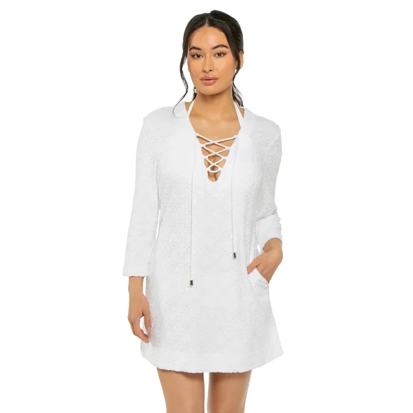 Tunic features terry texture, a lace-up v-neckline, and three quarter sleeves.