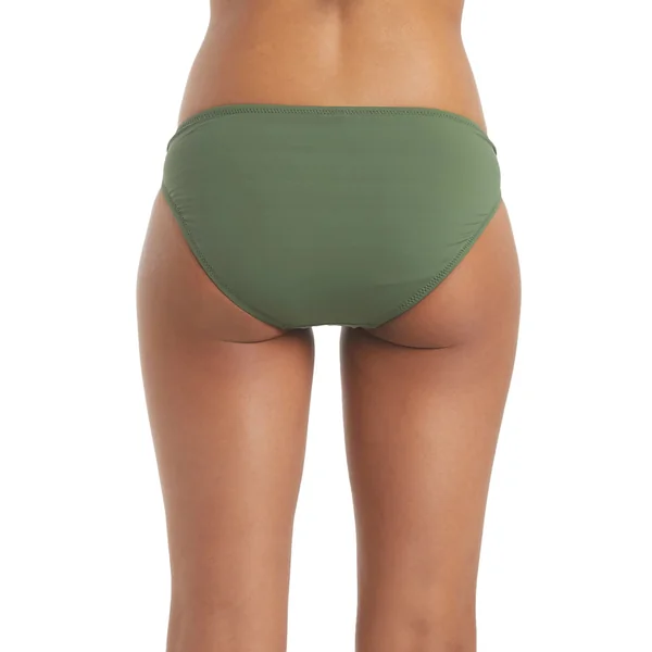Hipster bikini bottom features a texturized fabrication and ring side details and offers moderate coverage.