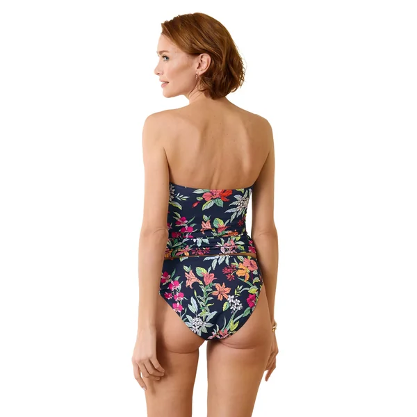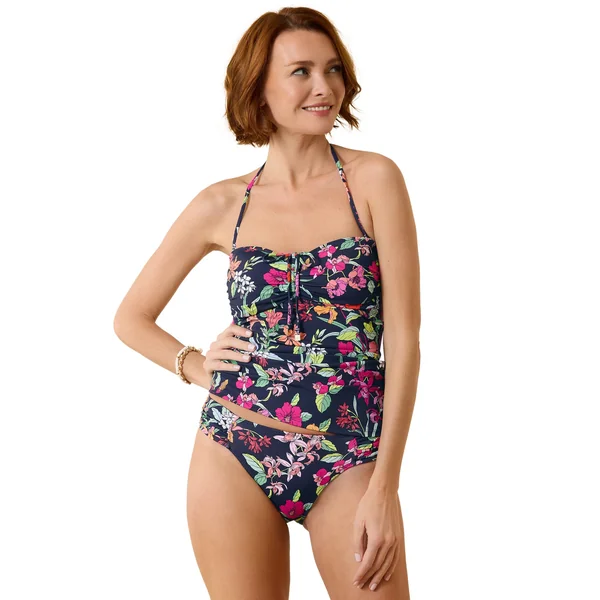 Tankini top features shirred detail and a tie front with TB logo cord ends. Offers molded cups for added support and a removable strap for versatile styling.
