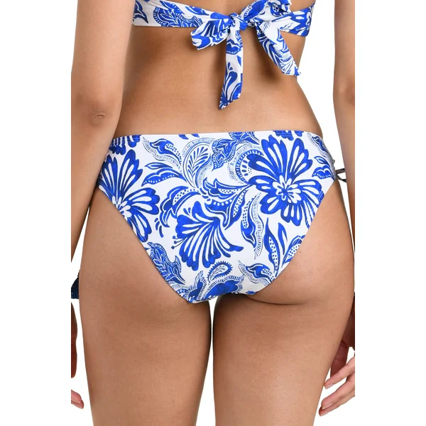 Bikini bottom features botanical print, adjustable side ties with tassel details, and moderate coverage.