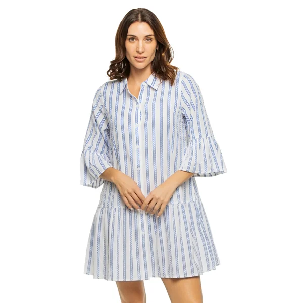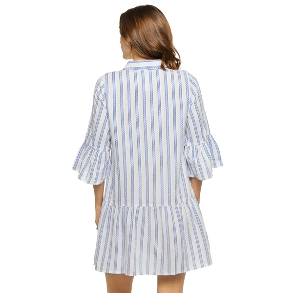 Mini dress features stripe printed fabric, 3/4 flared sleeves with a ruffle cuff, and a tiered hem. Offers a button up front and collared neckline.