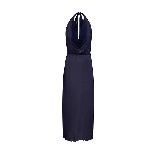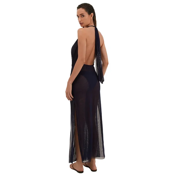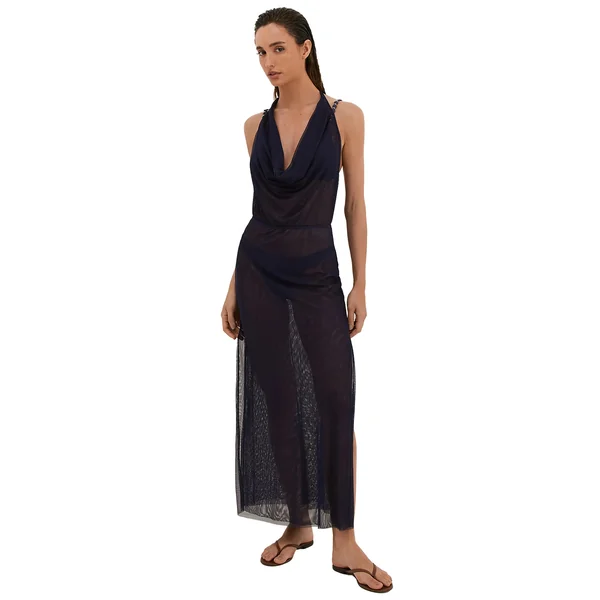 Mesh maxi dress features a draped neckline, long halter ties that drape down the back and side slits.