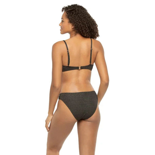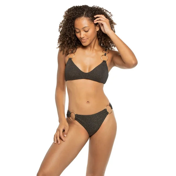 Tirari nights bikini top features textured fabric with metallic shimmer and adjustable straps with ring hardware details. Offers removable cups and side boning for shape definition.
