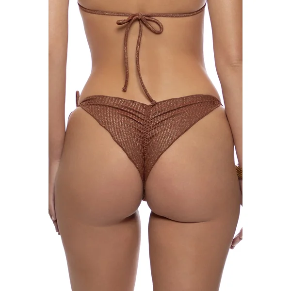 Bikini bottom features metallic ribbed fabric, gold plated ring details, adjustable tie sides, and minimal coverage.