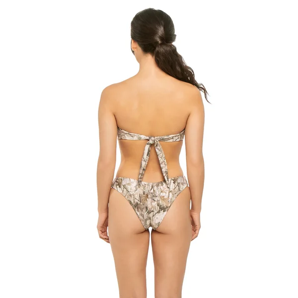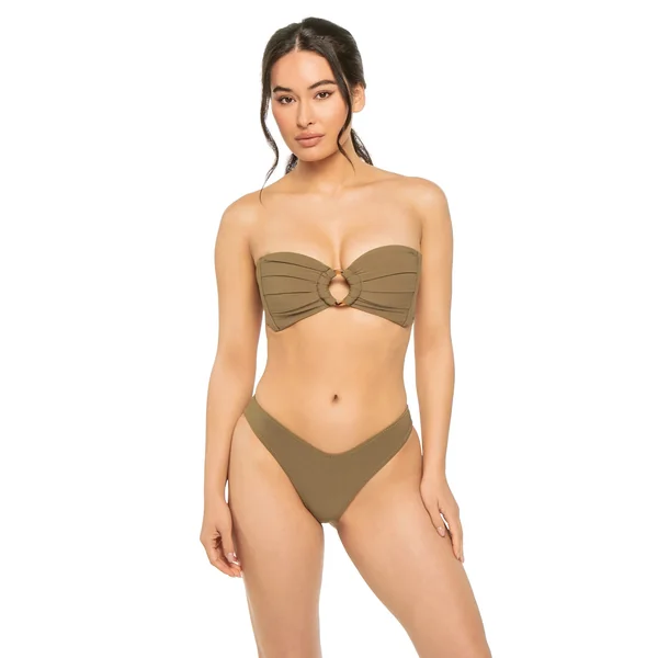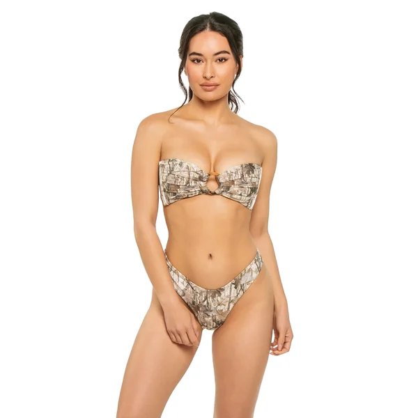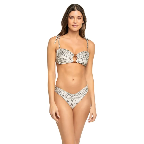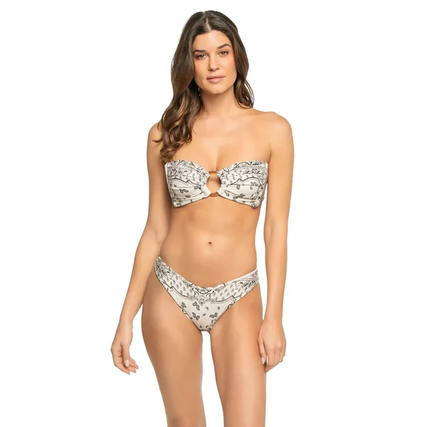Tori bandeau bikini top features bandana print, center ring accent, and ruched detailing. Offers side seam boning for support, removable over the shoulder tie straps and tie back closure.