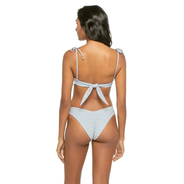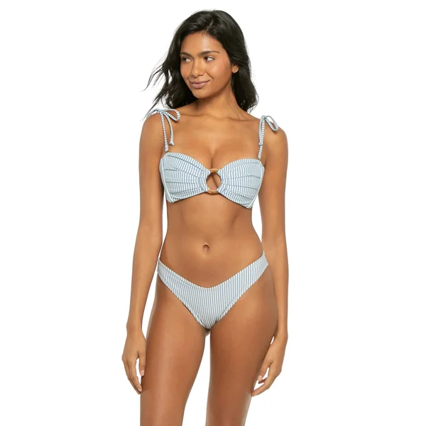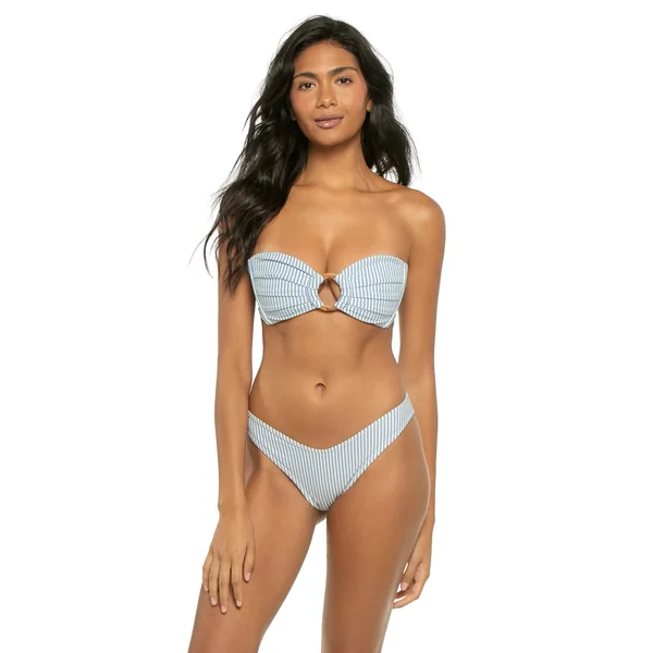 Tori striped bandeau bikini top features a center ring accent and ruched detailing. Offers side seam boning for support, removable over the shoulder tie straps and tie back closure.