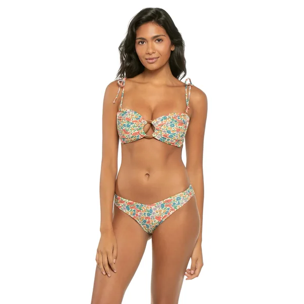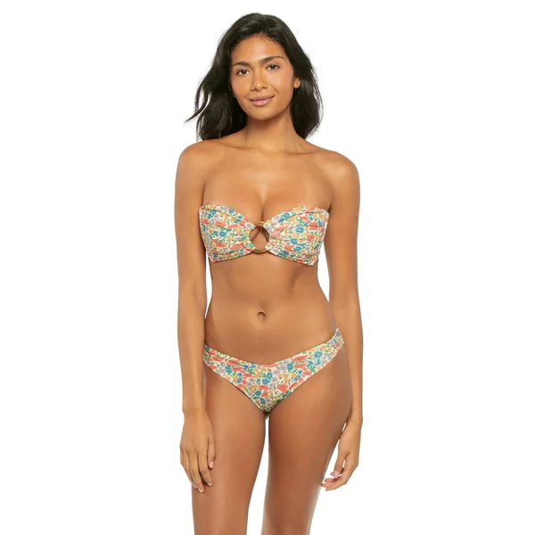 Tori floral bandeau bikini top features a center ring accent and ruched detailing. Offers side seam boning for support, removable over the shoulder tie straps and tie back closure.