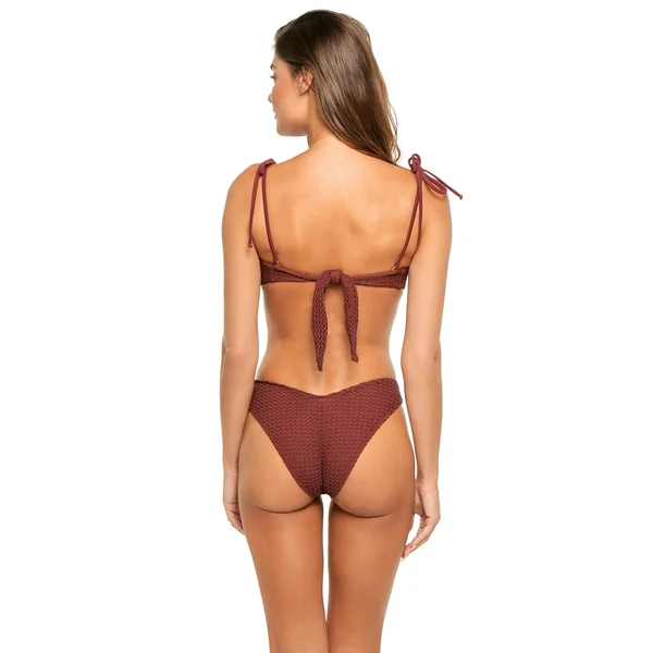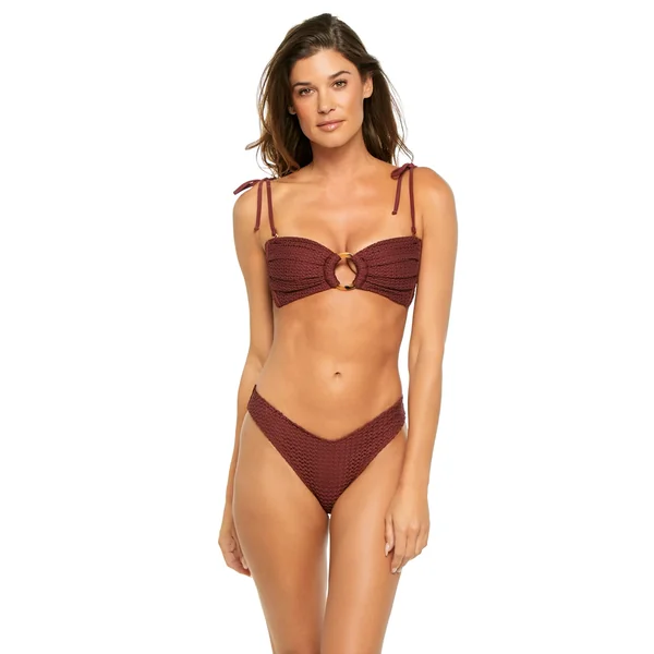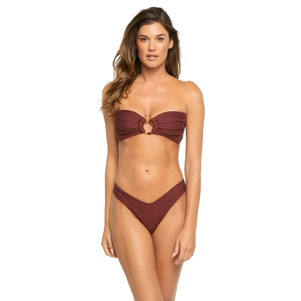 Tori bandeau bikini top features crochet overlay, a center ring accent, and ruched detailing. Offers side seam boning for support, removable over the shoulder tie straps and tie back closure.