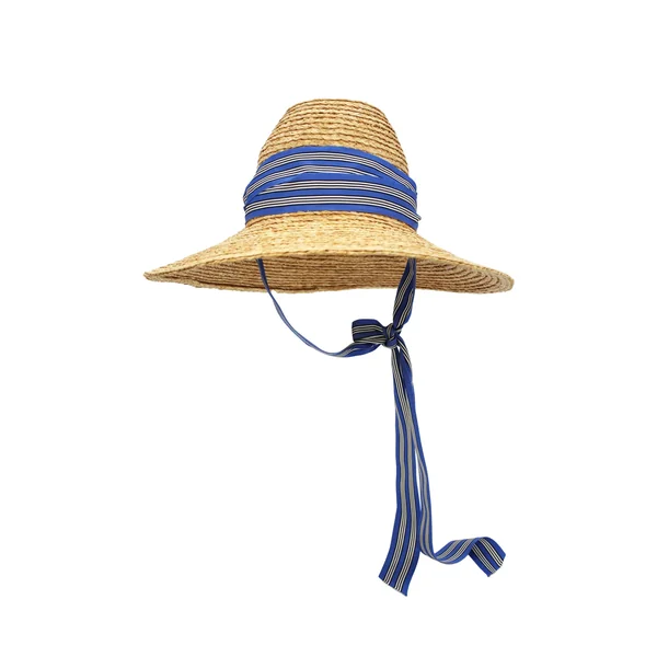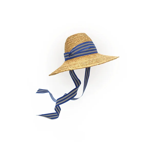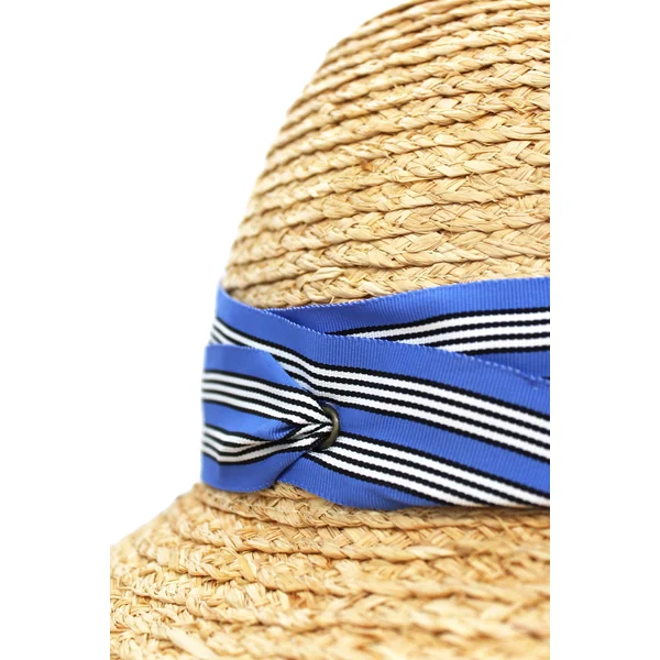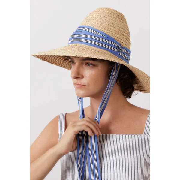 Transat sun hat features stitched wide raffia braids, high crown, wide brim, and striped ribbon that feeds through small eyelets keeping the hat secure in windy weather.