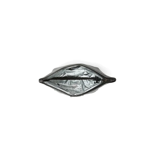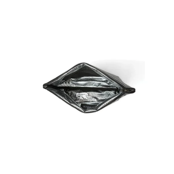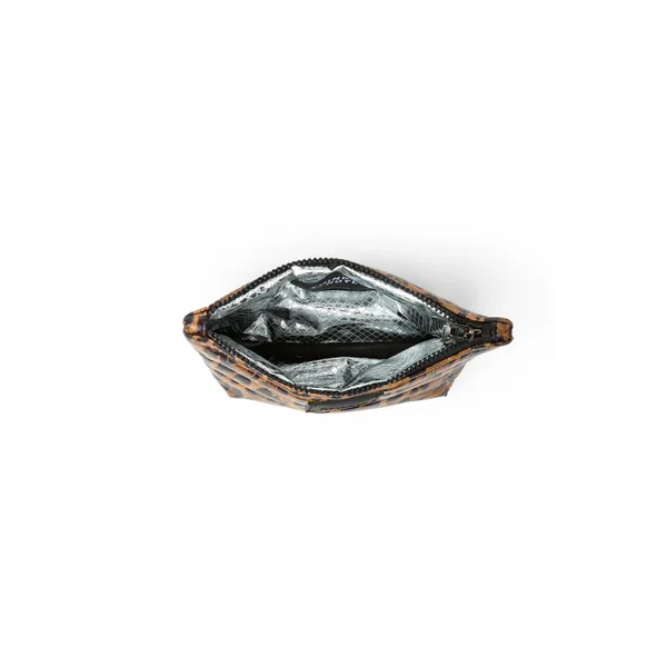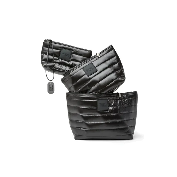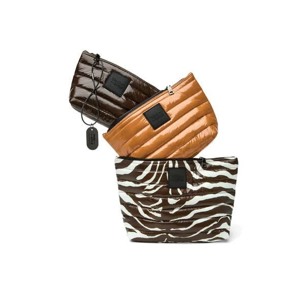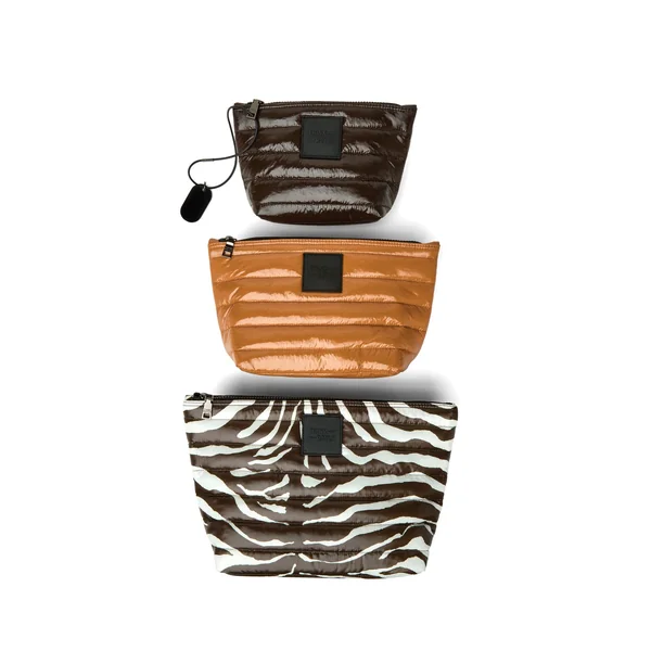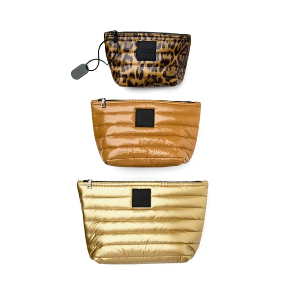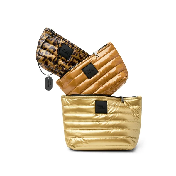 Pouches feature a quilted exterior, lined with a silver foil finish, rubber patch on the front, and a top zipper closure.