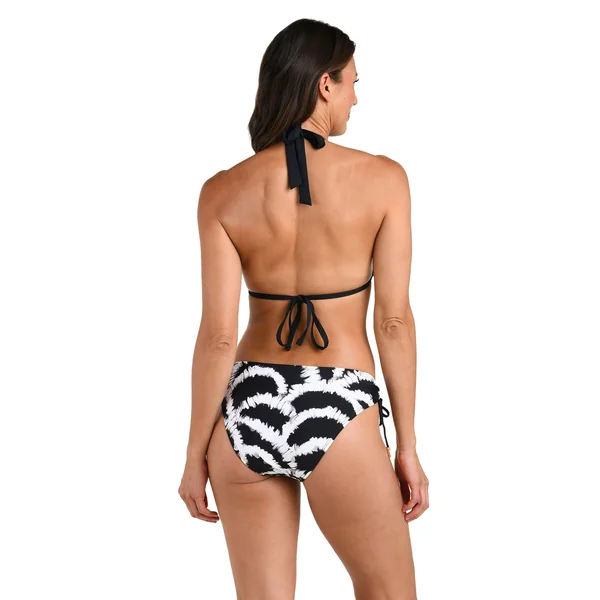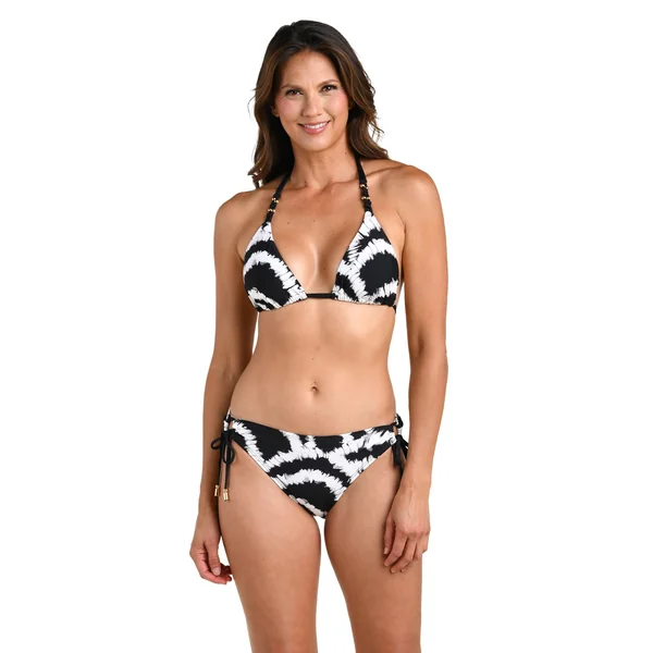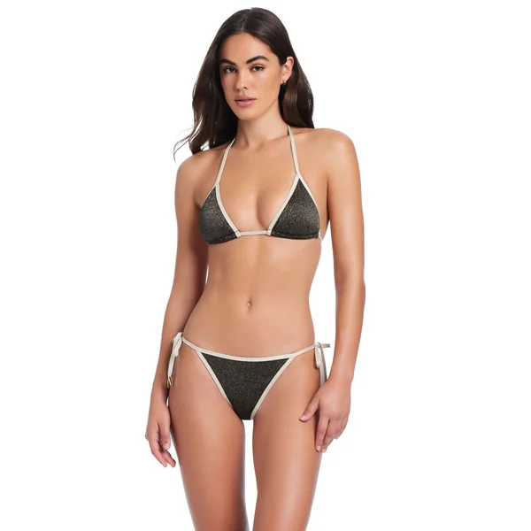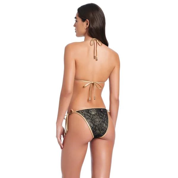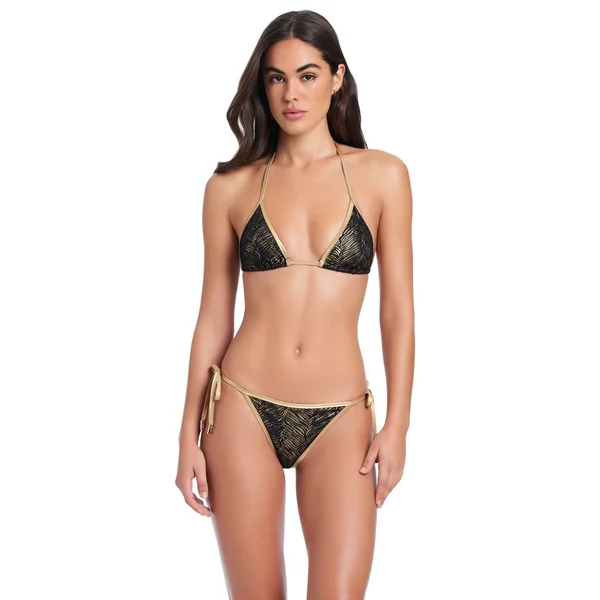 Bikini top features knotted straps adorned with gold beaded hardware. Offers adjustable neck and back ties and molded cups.
