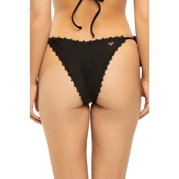 Trinidad brazilian bikini bottom features crochet with shiny threads overlaying lycra shine fabric. Offers adjustable ties at hips and minimal coverage.