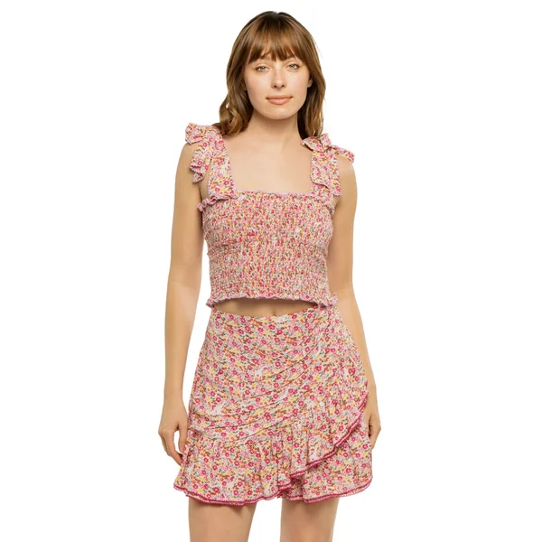 Triny crop top features a delightful floral print, smocked bodice, square neckline, and wide straps that tie at the shoulder, revealing a bow-like detail.