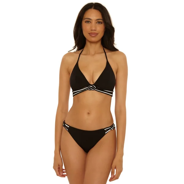Ribbed bikini top features knotted rope under-bust band. Offers removable soft cups, adjustable halter ties with gold-plated bead details, and a tie back closure.