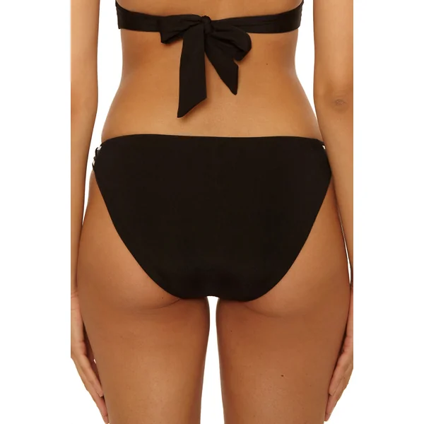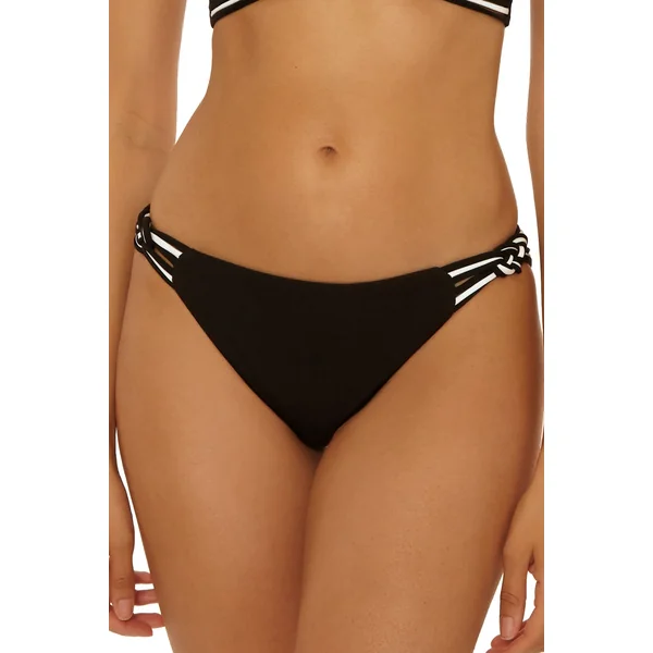 Ribbed bikini bottom features contrast knotted rope sides and offers moderate coverage.