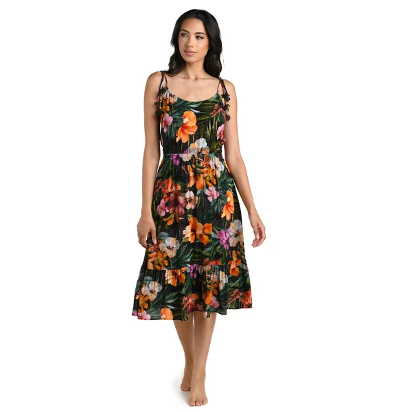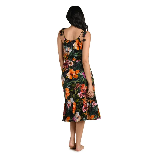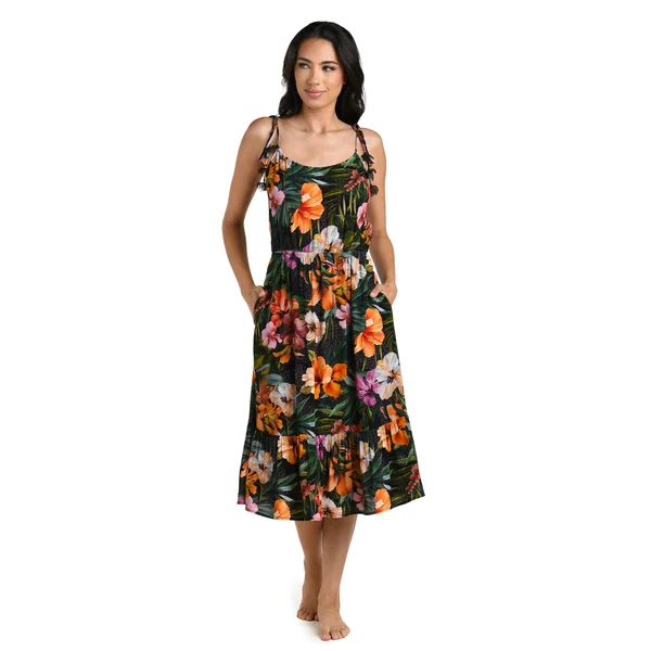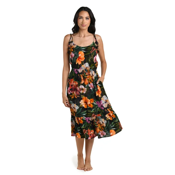 Midi dress features a round neckline, adjustable shoulder ties adorned with sheer flower tassels, gathered waist and side pockets.