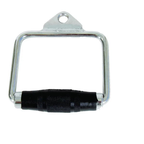 This cable attachment handle is made of solid steel with a chrome finish. It features a contoured rubber grip for improved hold and feel. Weighs 3 pounds.