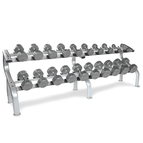 Each dumbbell set comes with a rack that ensures complete organization of every weight. Molded-in weight indicators on each dumbbell allow for easy identification and never rub off. Rack holds up to 10 pairs of dumbbells with a 2,100 lb weight capacity and is (90″L x 22″W x 31″H; 137 lb).