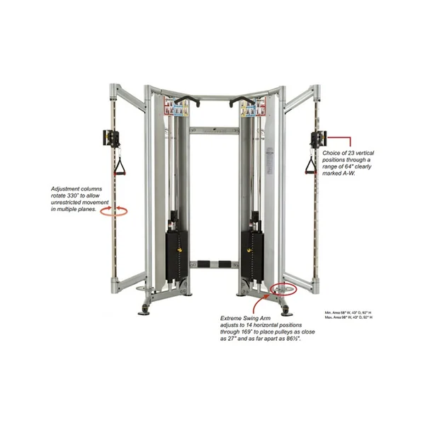 - Choice of 14 horizontal positions through 169˚ clearly marked 1-14 using conveniently located foot pedals to position pulleys as close as 27″ and as far a part as 86 ½”.