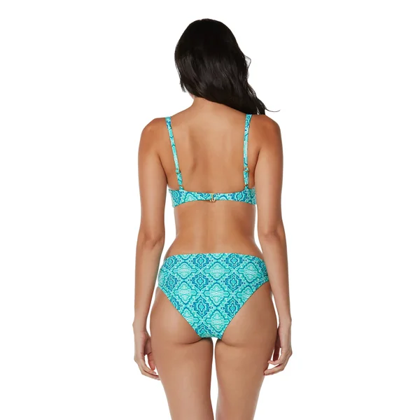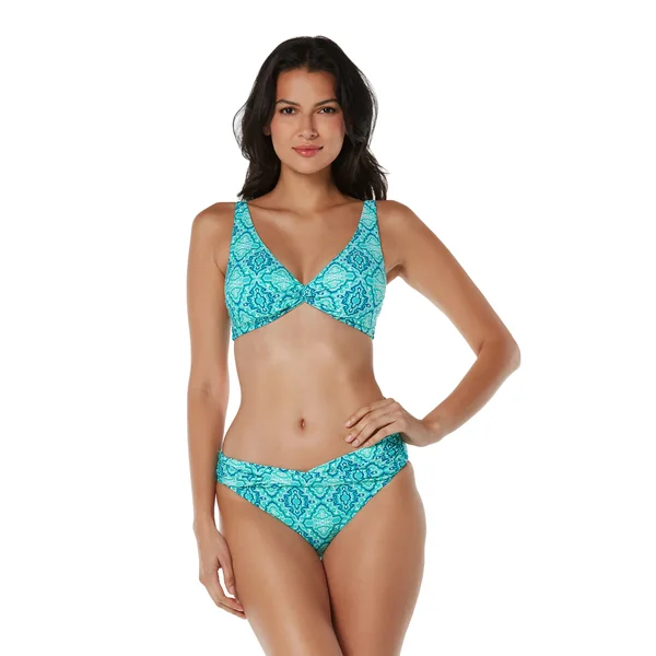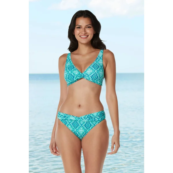 Bralette bikini top features geometric tile print and a twist front. Offers adjustable straps, removable soft cups and adjustable hook back closure.