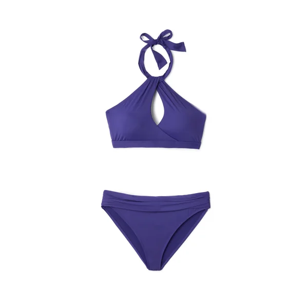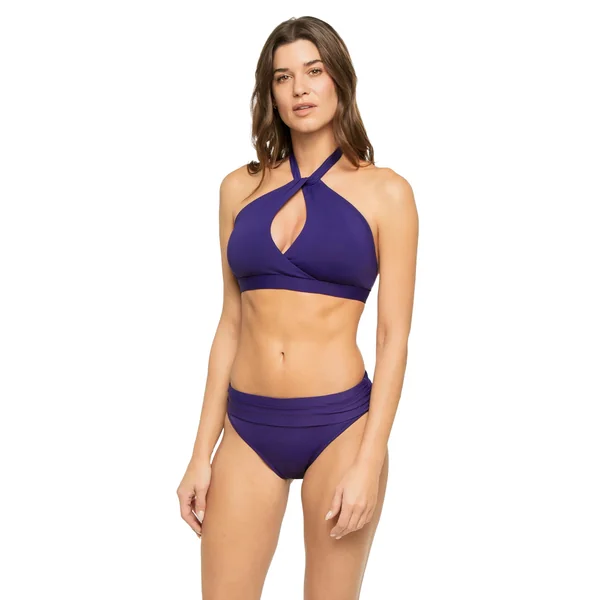 Bikini top features twisted high neckline with keyhole front. Offers removable soft cups and adjustable halter strap and hook back closure.
