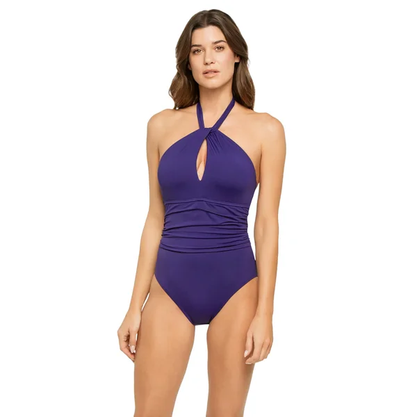 One piece swimsuit features twisted high neckline and shirred detailing at the bodice. Offers removable soft cups, adjustable halter strap, and moderate bottom coverage.