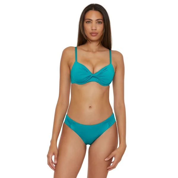 Bikini top features twisted front detailing and offers supportive underwire, adjustable straps, and tie back closure.
