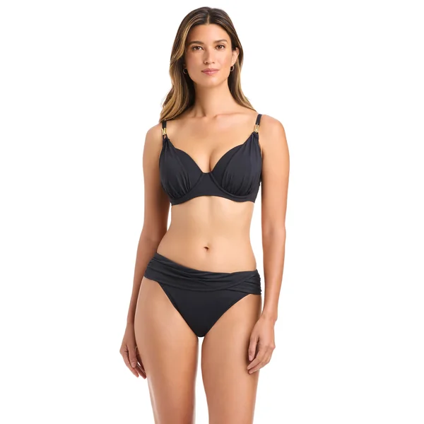 Bikini top features gold hardware accenting the straps straps and shirred cups. Offers underwire support, molded cups, adjustable straps, and a hook-back closure.