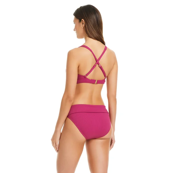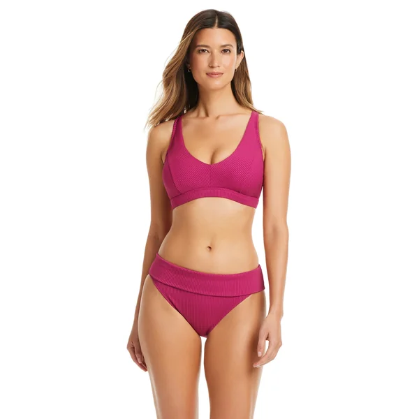 Textured bralette bikini top offers underwire support, removable cups, and an adjustable crossback design.