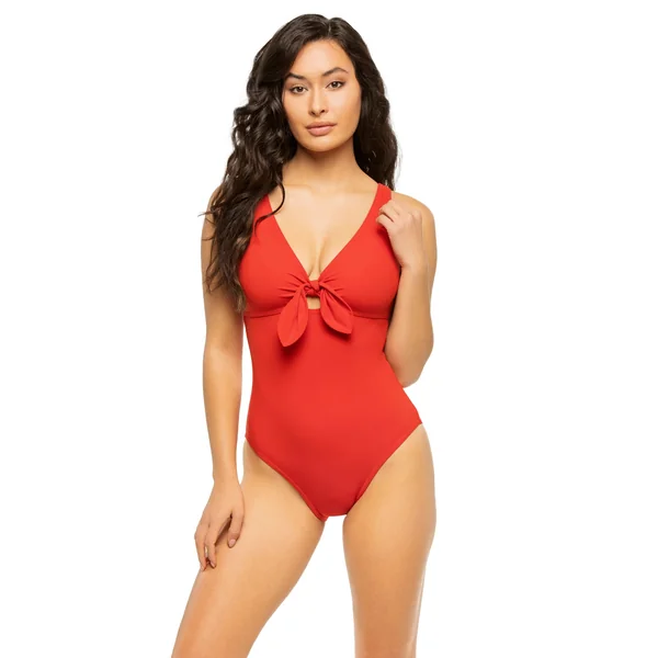 One piece swimsuit features a v-neckline with bow tie detail and offers supportive underwire, wide straps and moderate bottom coverage.