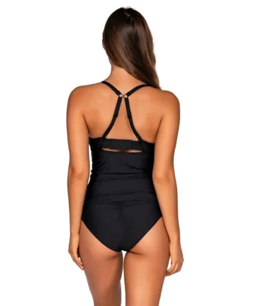 This sleek twist tankini provides full coverage and support, perfect for any woman who is seeking a fashionable top with a strong foundation. Special features include over the shoulder adjustable straps, hidden floating underwire, powernet bra for maximum support, plush logo picot elastic, and matching colored lining.