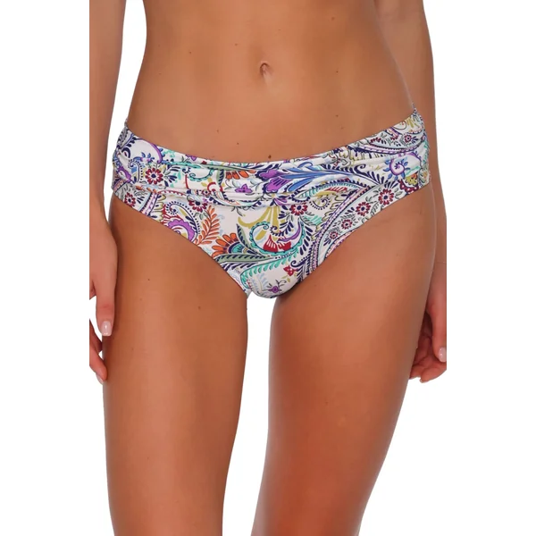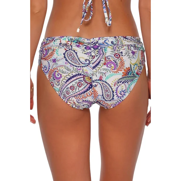 Unforgettable hipster bottom features shirred band, cinched back detail and matching colored lining at front and back. Sits straight across the hip.