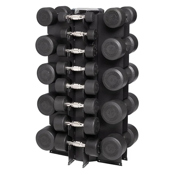 The urethane-coated Dura-Pro dumbbells’ compact design allows you to choose from both our vertical and horizontal racking systems. Our unique 35mm. contoured handle features a fine-grade knurling. This design supports the natural arch of the hands and gives the end-user an exceptional experience in every workout. The Dura-Pro dumbbell delivers comfort, function and durability- the foundation of what club owners and gym members have come to expect. They come in sizes 2.5 lbs. up to 130 lbs. The dumbbells over 100 lbs. have rubber heads. Covered by a 5-year warranty.