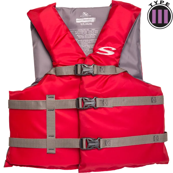The red adult universal classic life vest is Coast Guard approved general boating. This classic series life jacket is made out of nylon and PE foam and features 3 buckles and open sides.