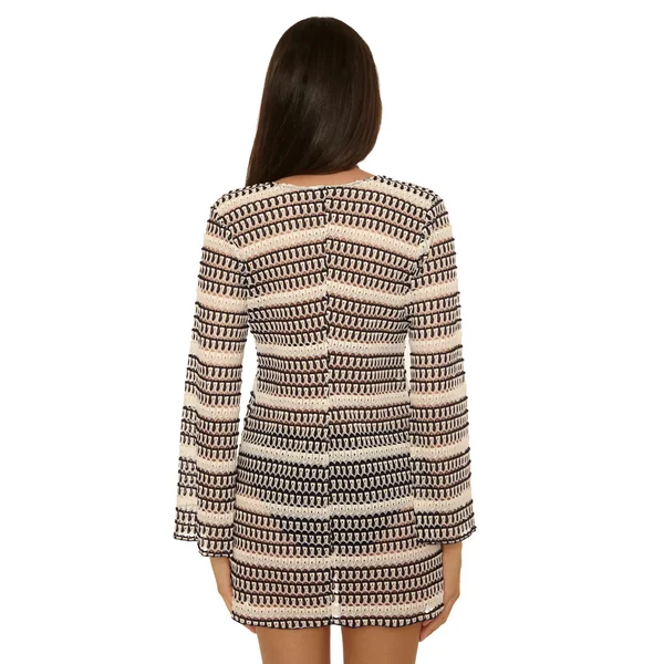 Crochet tunic features a plunging neckline with gold tube bead details and side slits.