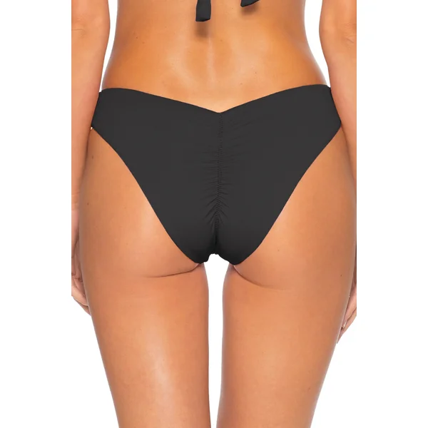 V-Front brazilian bikini bottom features a high leg cut and cinched back. Offers skimpy coverage.