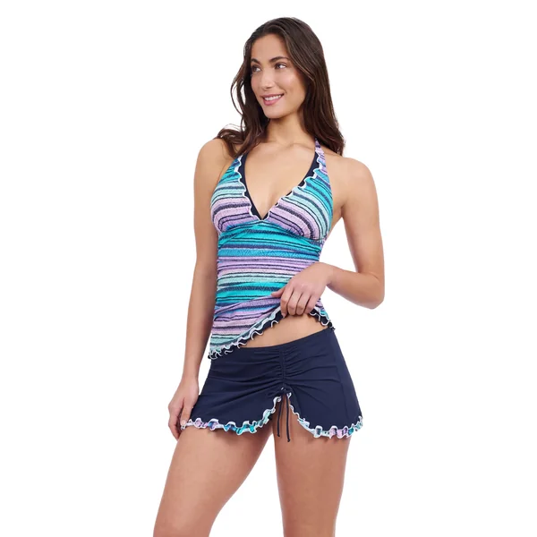 Tankini top features a v-neckline with ruffle hem, soft cups, and adjustable neck tie.