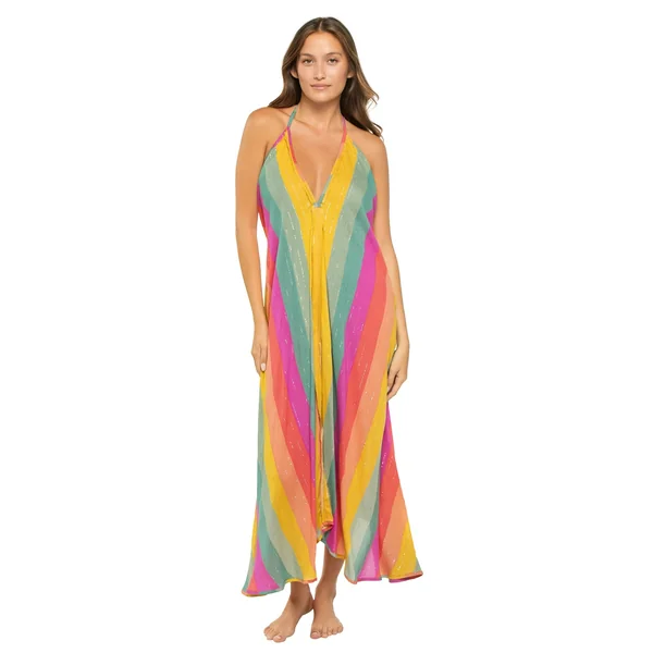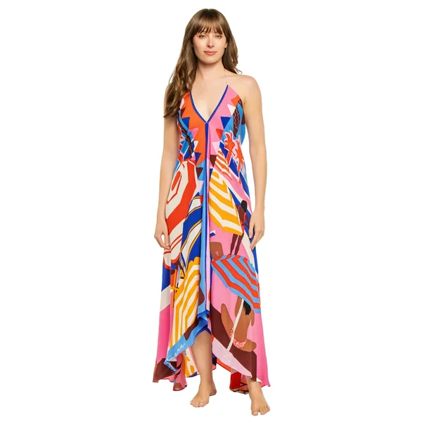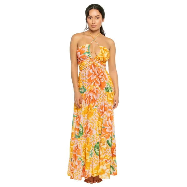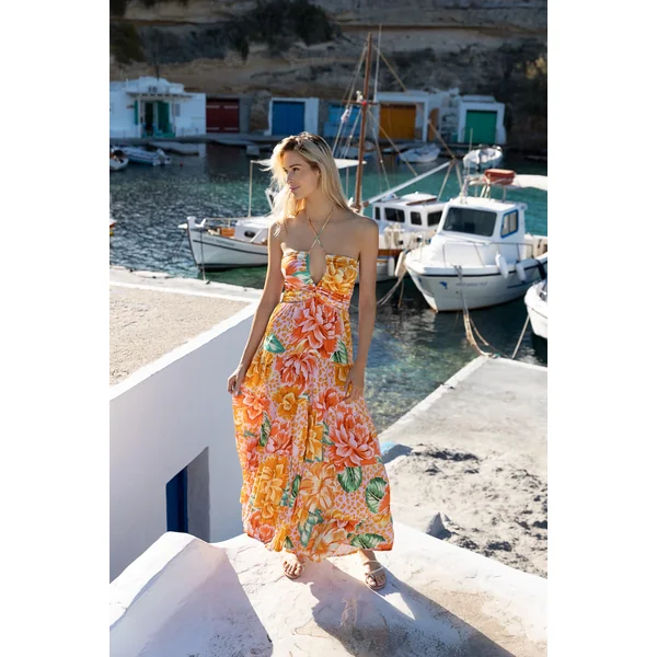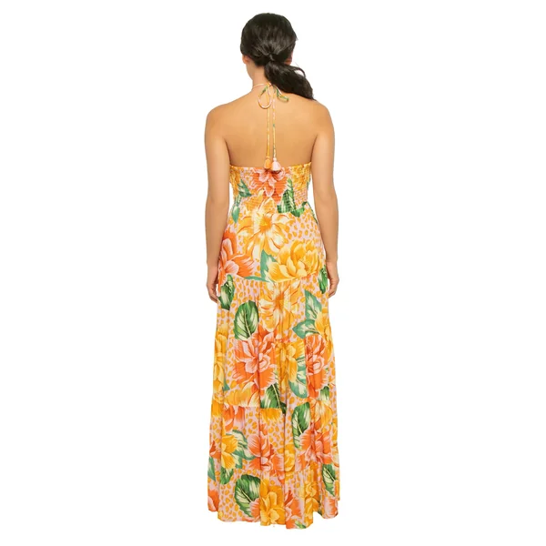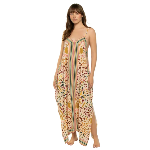 Maxi dress features a v-neckline, adjustable shoulder straps, an open back with v-shaped design and side slits.