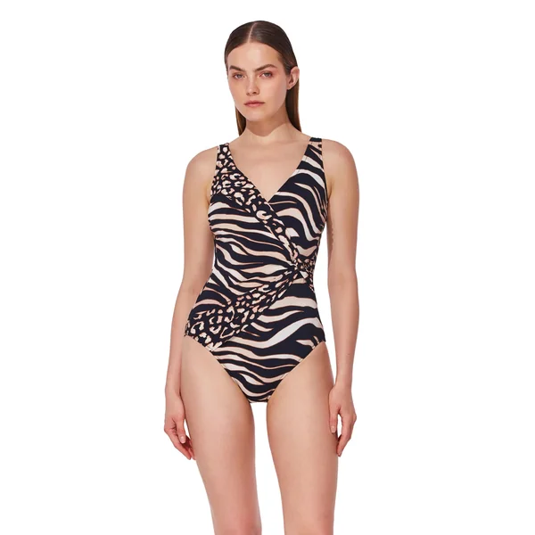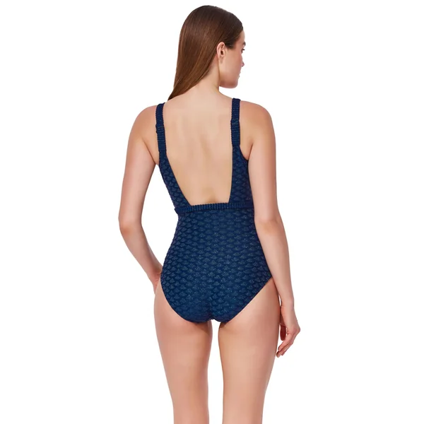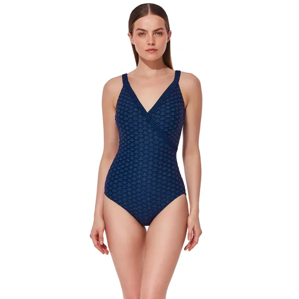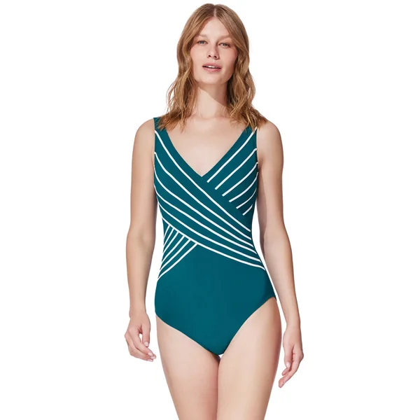 One piece swimsuit features a v-neck surplice neckline and offers soft cups, adjustable straps, tummy control and full bottom coverage.