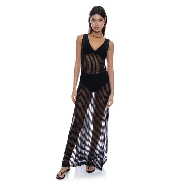 Maxi dress features crochet style fabric, v-neckline, and two slits to highlight the legs.