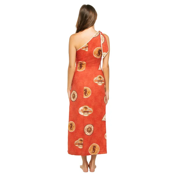Midi dress features an asymmetrical neckline with a tie closure, ruching that gathers at the waist and a slit skirt.