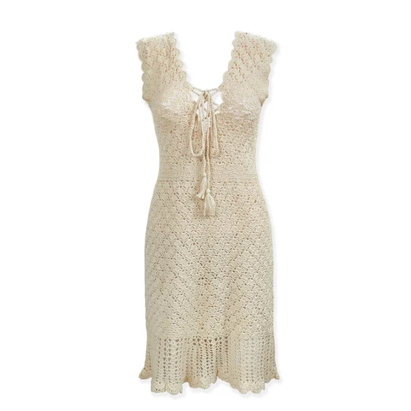 Hand crocheted dress features a plunging neckline with lace-up ties adorned with tassels.