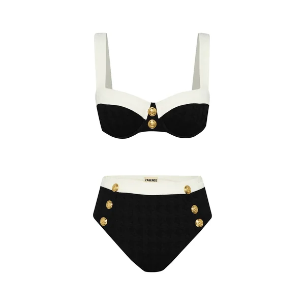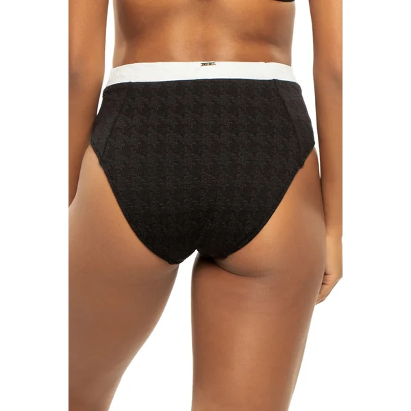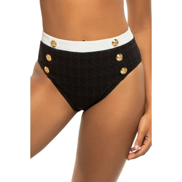 Venessa bikini bottom features textured fabric with a flattering high waist, accented by a contrasting white band and gold medallion buttons on each hip. Offers a high leg cut and moderate coverage.