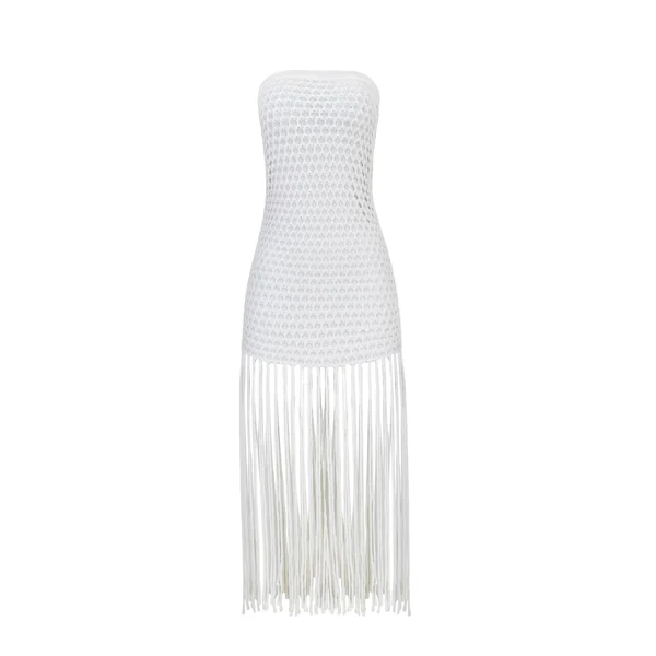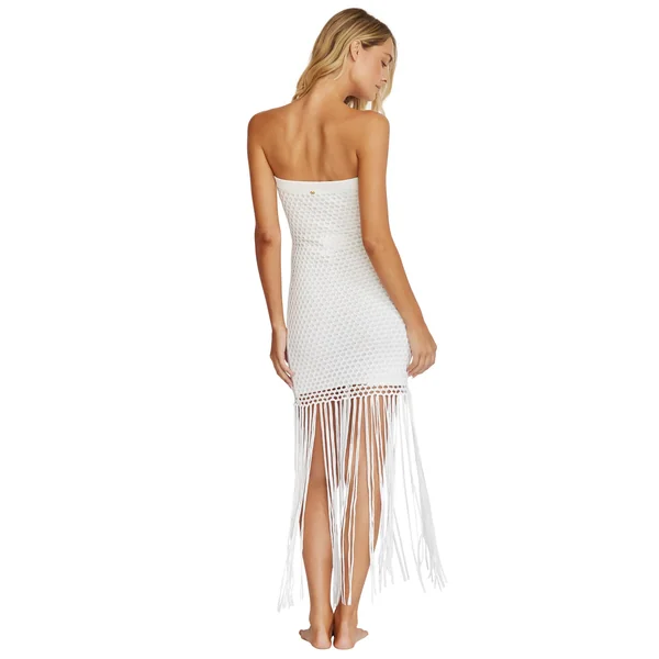 Vanessa midi dress features an overlay of net macramé, long flirty fringe hem, and offers a pull over fit.
