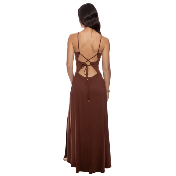 Maxi dress features a plunging neckline with gold-plated ring accents, slit skirt, and offers an adjustable crossback tie.