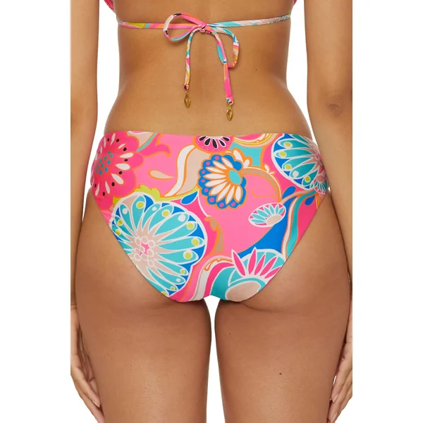 Bikini bottom features floral print, adjustable tie sides, and moderate coverage.